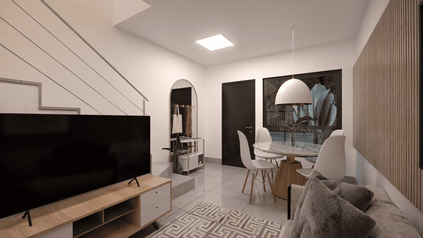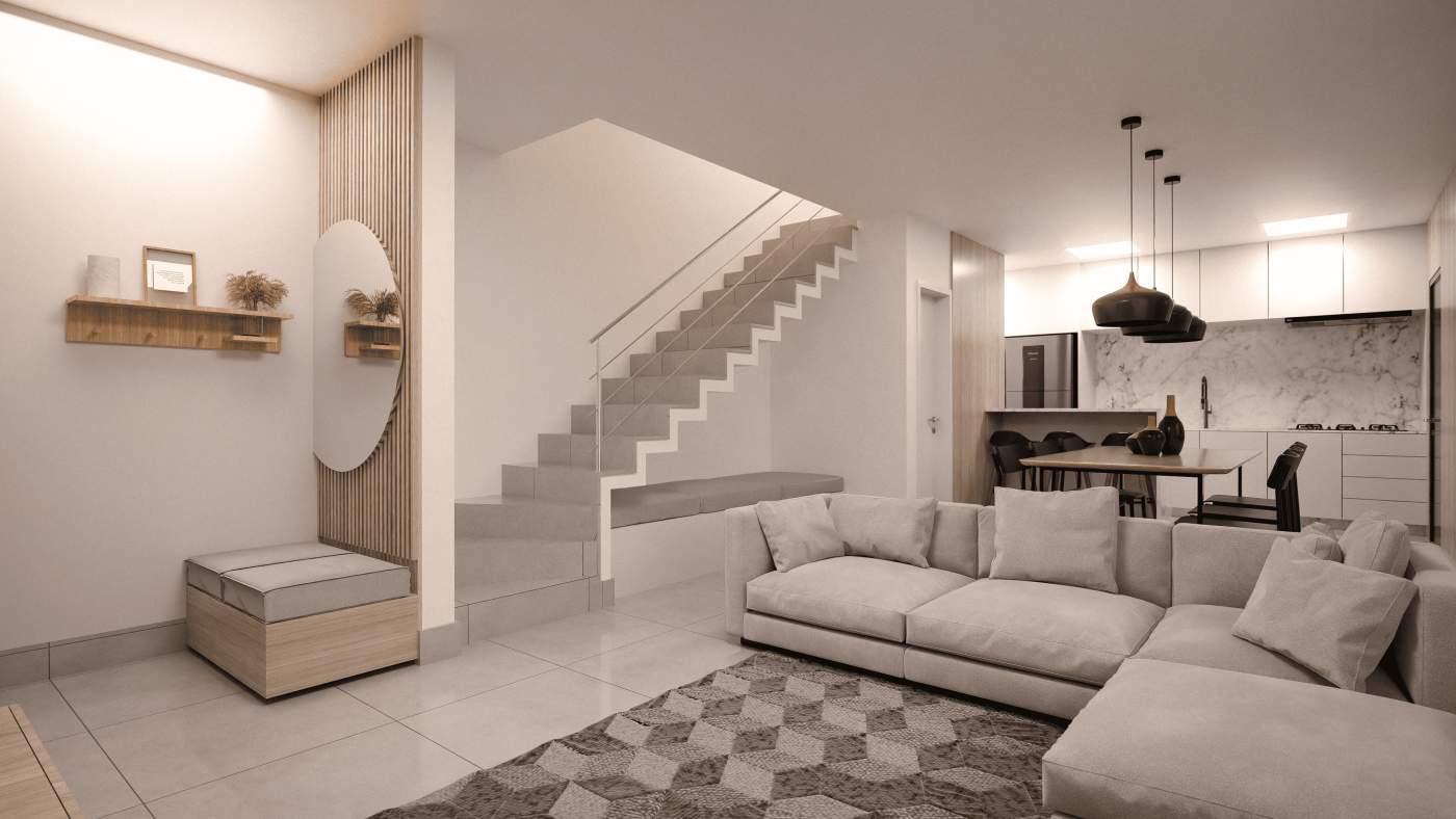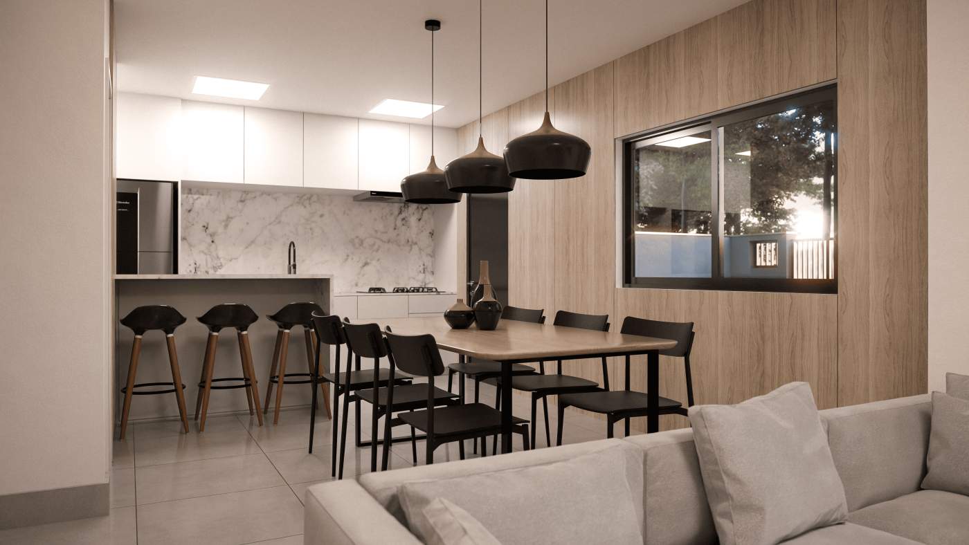 ✅ Sala de estar, jantar e cozinha integradas, criando um ambiente amplo e acolhedor