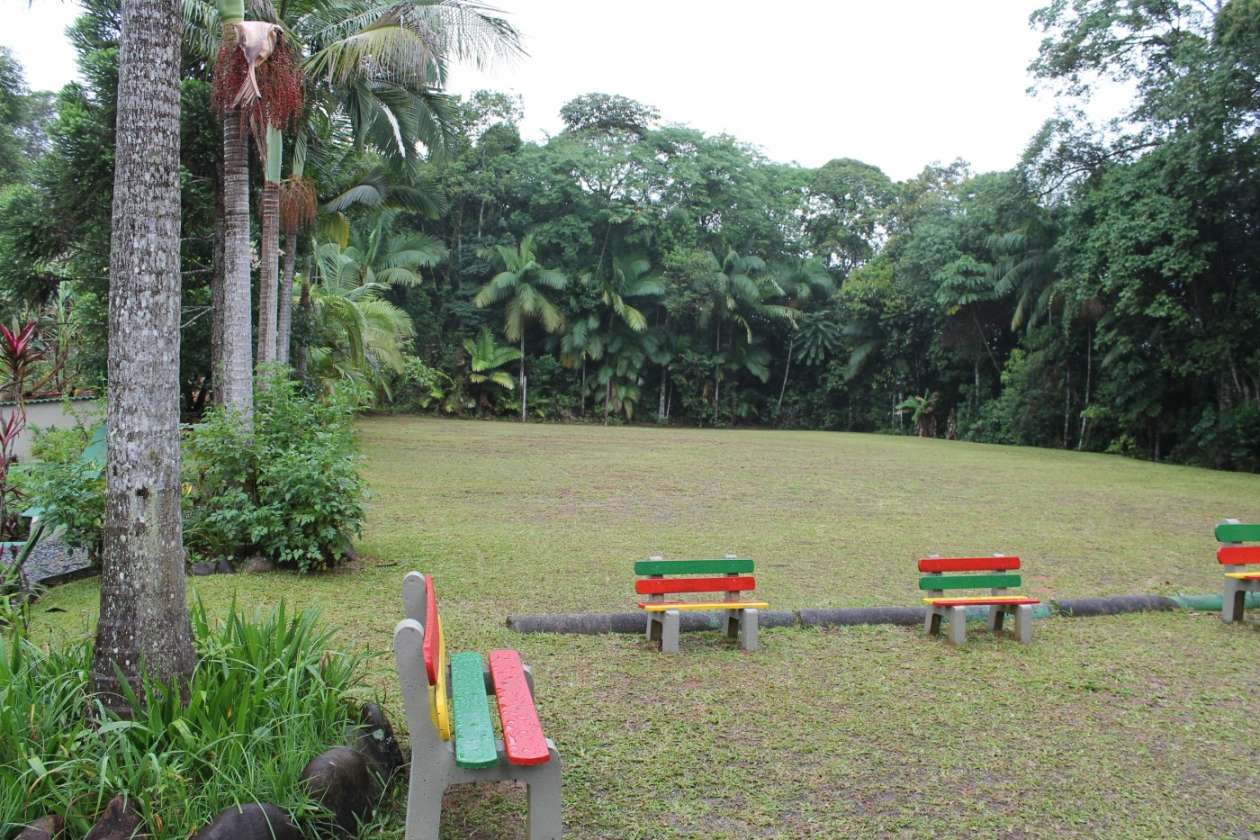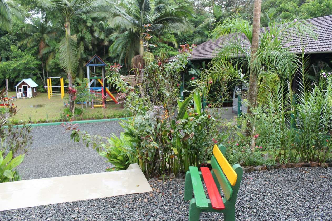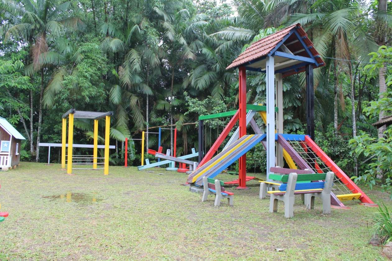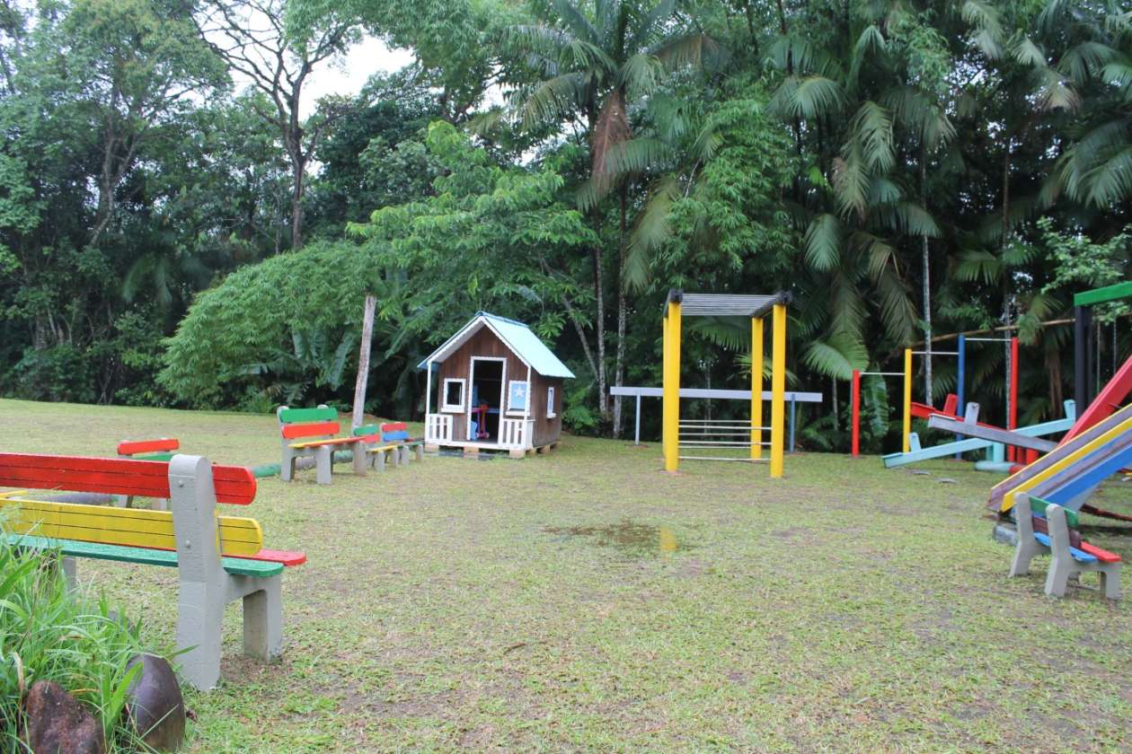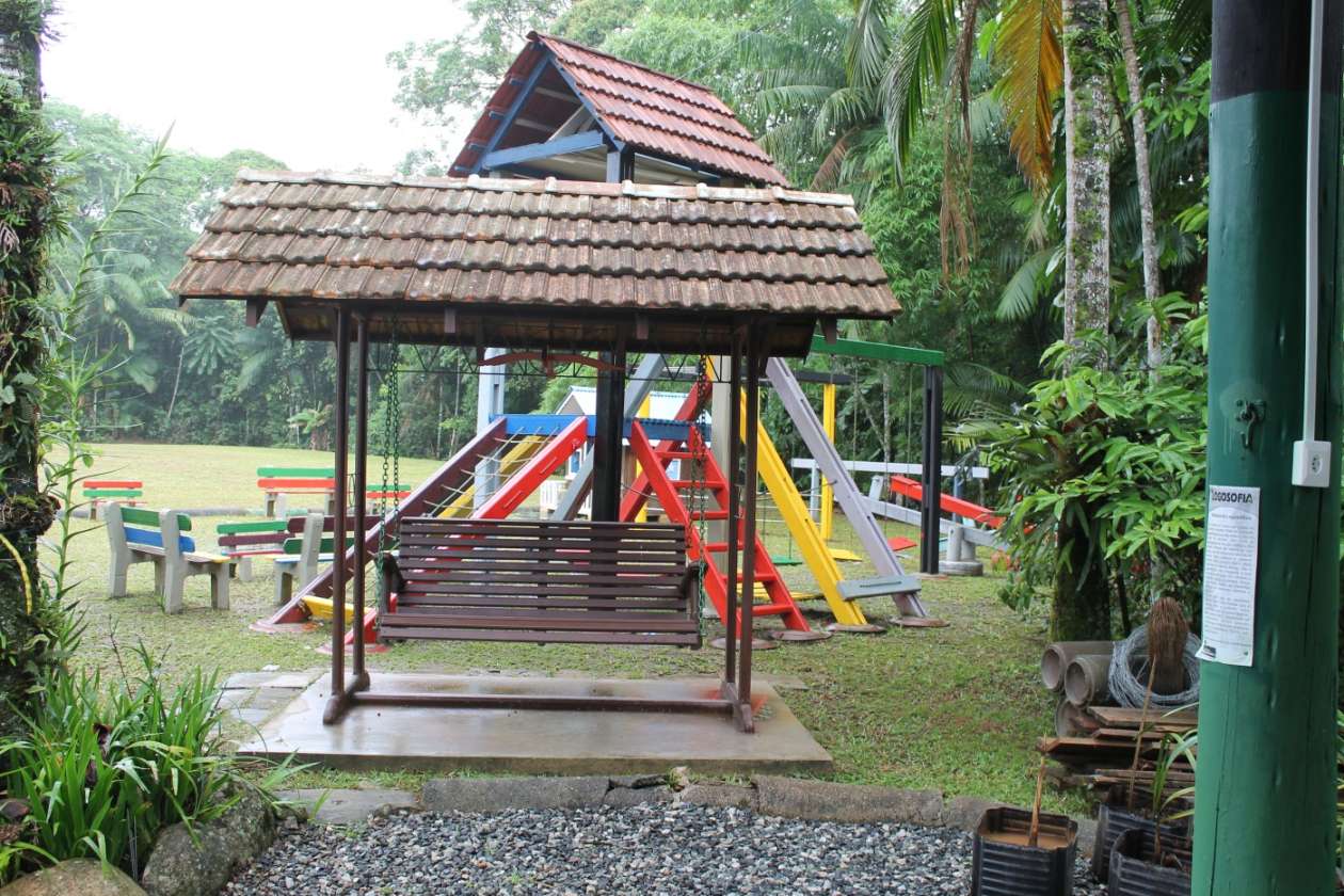 A estrutura impressiona com um telhado imponente e um design que valoriza a iluminação e ventilação natural. O entorno é um verdadeiro paraíso: árvores frutíferas e um playground garantem lazer e bem-estar para todas as idades.