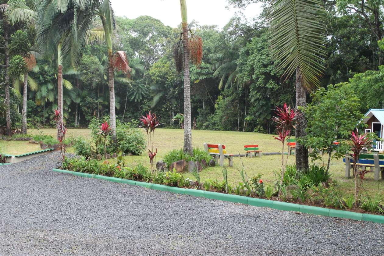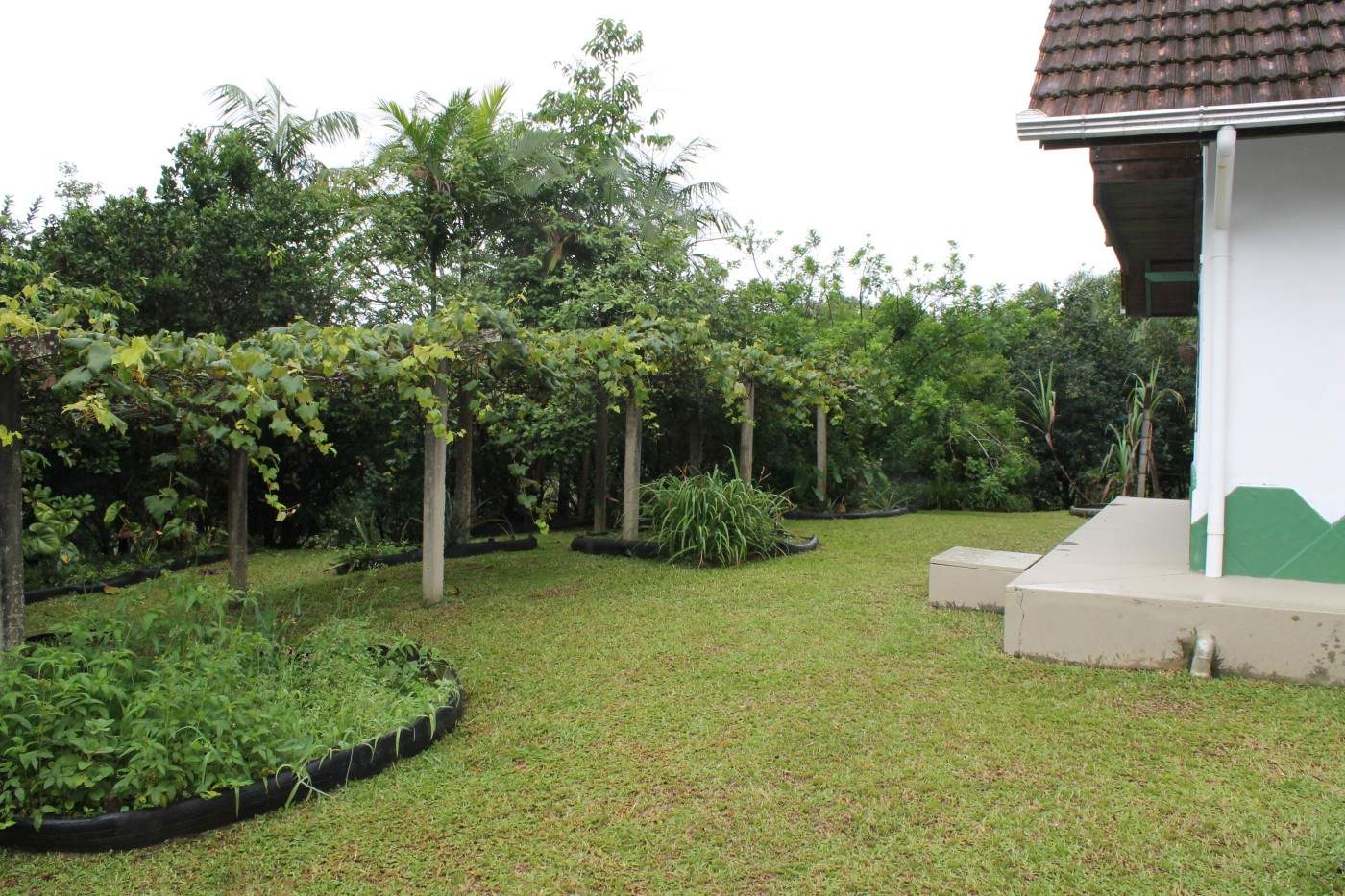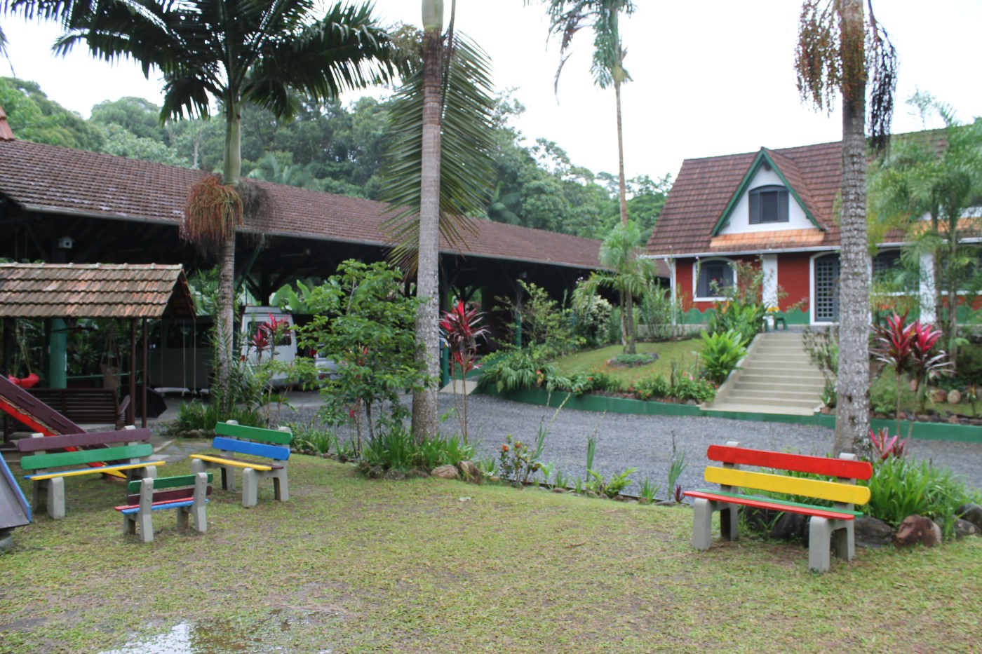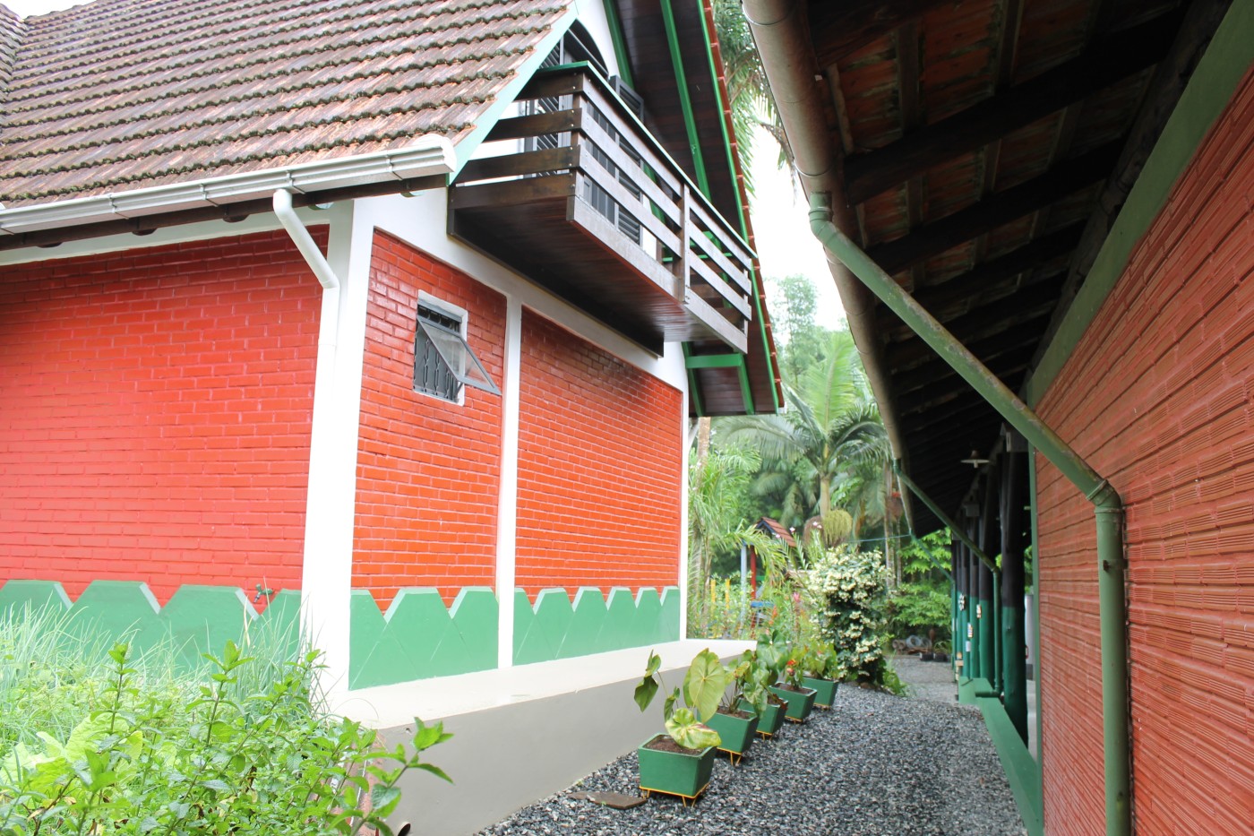 A estrutura impressiona com um telhado imponente e um design que valoriza a iluminação e ventilação natural. O entorno é um verdadeiro paraíso: árvores frutíferas e um playground garantem lazer e bem-estar para todas as idades.